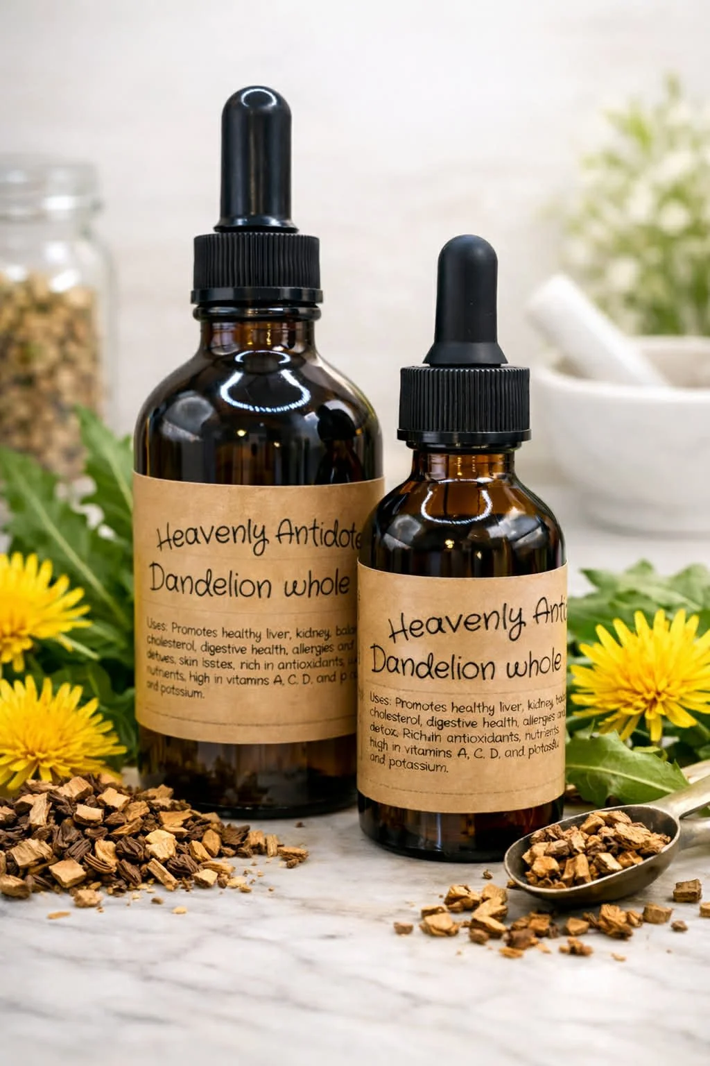 The entire, freshly harvested dandelion plant: root to blooms are used in this wonderful tincture. Mixed with 80-100 proof alcohol in a glass container. Sealed and stored in a cool dark place for 8+ weeks
